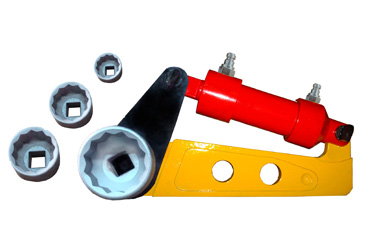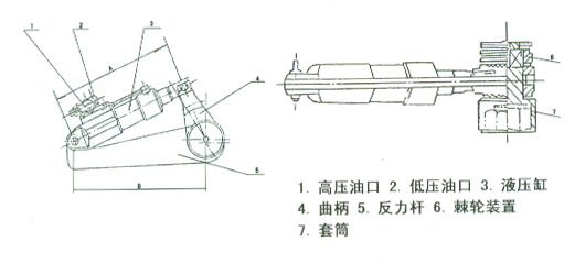 手動高壓泵由操縱手柄,高壓泵、換向閥、油箱、壓力表和帶快速接頭的輸油管等組成。帶棘輪式液壓扳手由高壓油口、液壓油缸、曲柄、反力桿、棘輪裝置、套筒等組成、前者系動力源部件,后者為扭矩執(zhí)行機(jī)構(gòu)。
